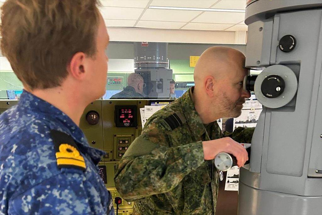 Generaal-majoor Robert Adang tuurt door een kijker op een marineschip.