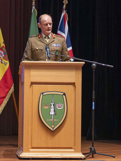 Publiek luistert naar een militair spreker op een podium.
