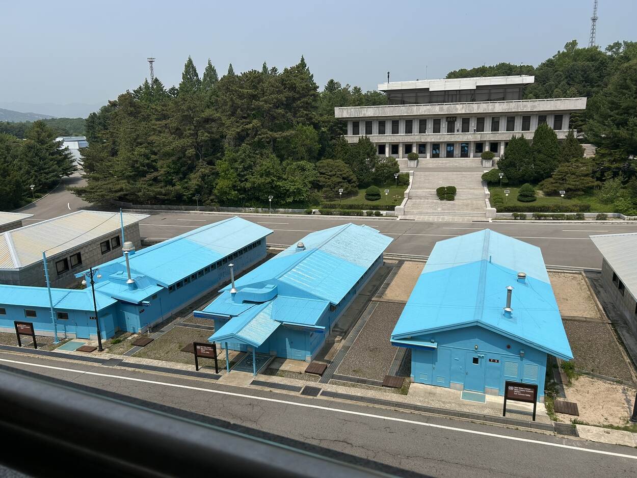 Op de grens van Noord- en Zuid-Korea bevindt zich een gedemilitariseerde zone met drie lage gebouwen, elk in twee tinten blauw. Het lichtblauwe deel staat op Noord-Koreaanse grond, het andere op Zuid-Koreaanse. Overleggen tussen noord en zuid vinden hier plaats aan een lange tafel, met daarbij ieder land in zijn eigen gedeelte.