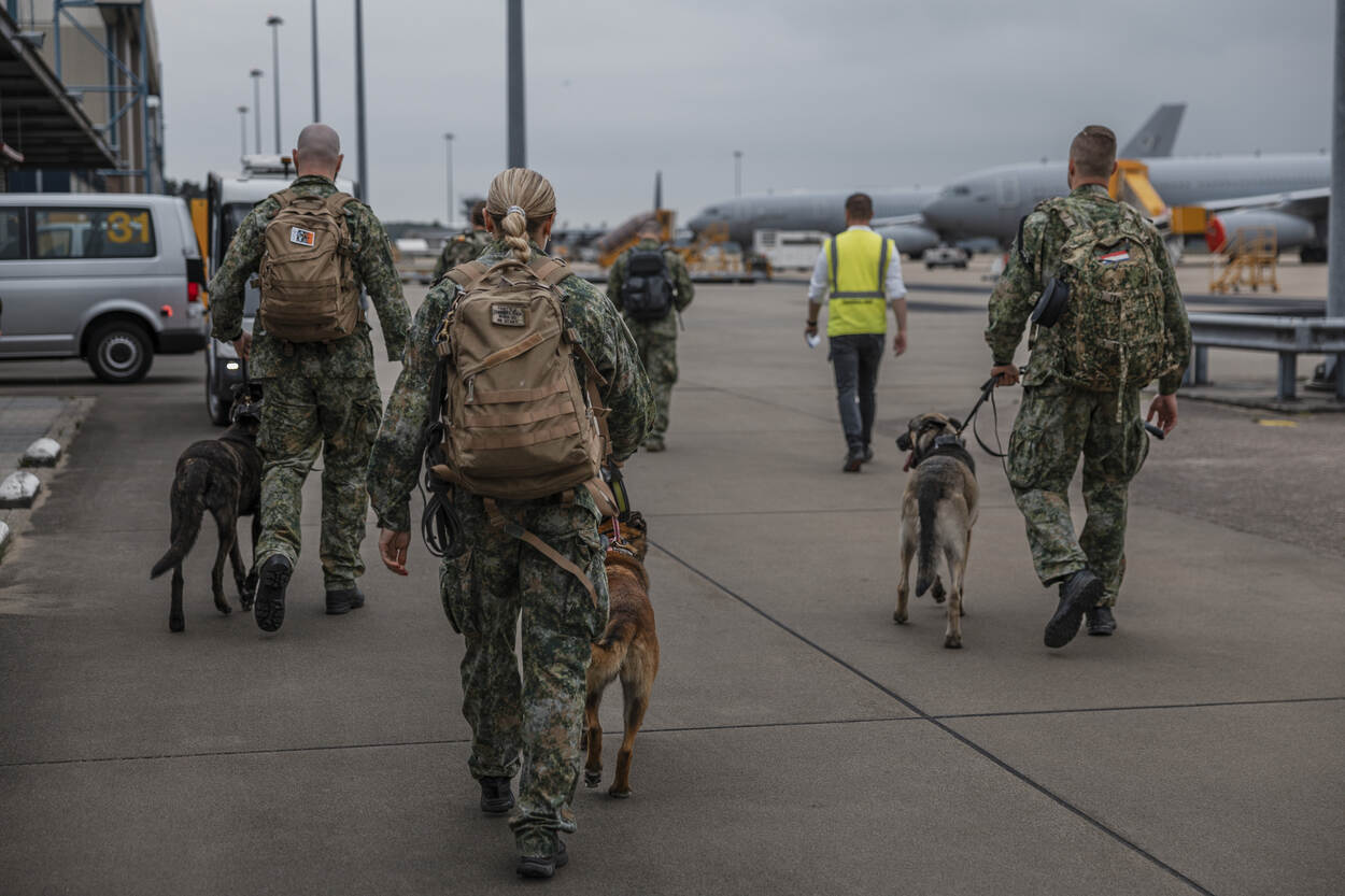 Militaire bewakers met honden lopen richting het vliegtuig.