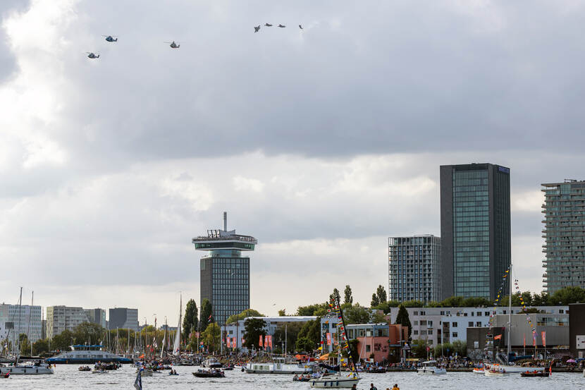 Op de eerste dag van het vijfdaagse SAIL-evenement, op 20 augustus, vlogen vier F-35’s en drie NH90’s tegelijk over het IJ in Amsterdam. Daarmee brachten ze een groet aan de tientallen schepen en bemanningsleden die op het water dobberden en de duizenden bezoekers van over de hele wereld. De fly-by was ter ere van de jarenlange samenwerking tussen de Nederlandse krijgsmacht en SAIL Amsterdam, een van ’s werelds grootste nautische evenementen. Het was een spectaculair gezicht tijdens de tiende editie van SAIL. Eén NH90 was ook van dichtbij te zien. Het toestel stond geparkeerd op het achterdek van Zr.Ms. Evertsen. Bezoekers konden er in gesprek gaan met de helikopterbemanning. Foto: sergeant Gregory Fréni