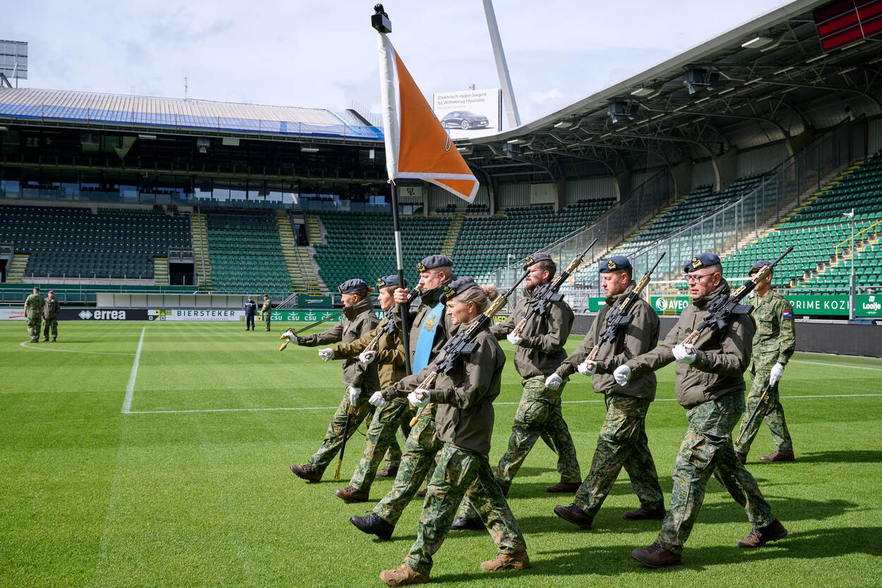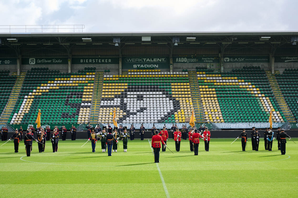 Een goede uitvoering vergt een strakke voorbereiding. Enkele dagen voor Prinsjesdag kwam een groep militairen daarom samen in het stadion van voetbalclub ADO Den Haag. Op de speelkalender: de generale repetitie voor het intreden van de vaandelwachten. Ook de luchtmacht gaf acte de présence en het resultaat mocht er zijn.