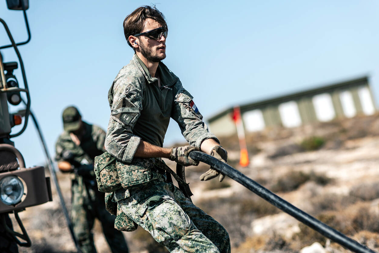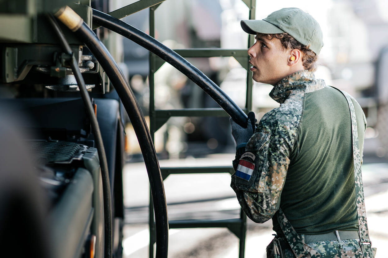 Een militair is bezig met de aansluiting van een grote kabel.