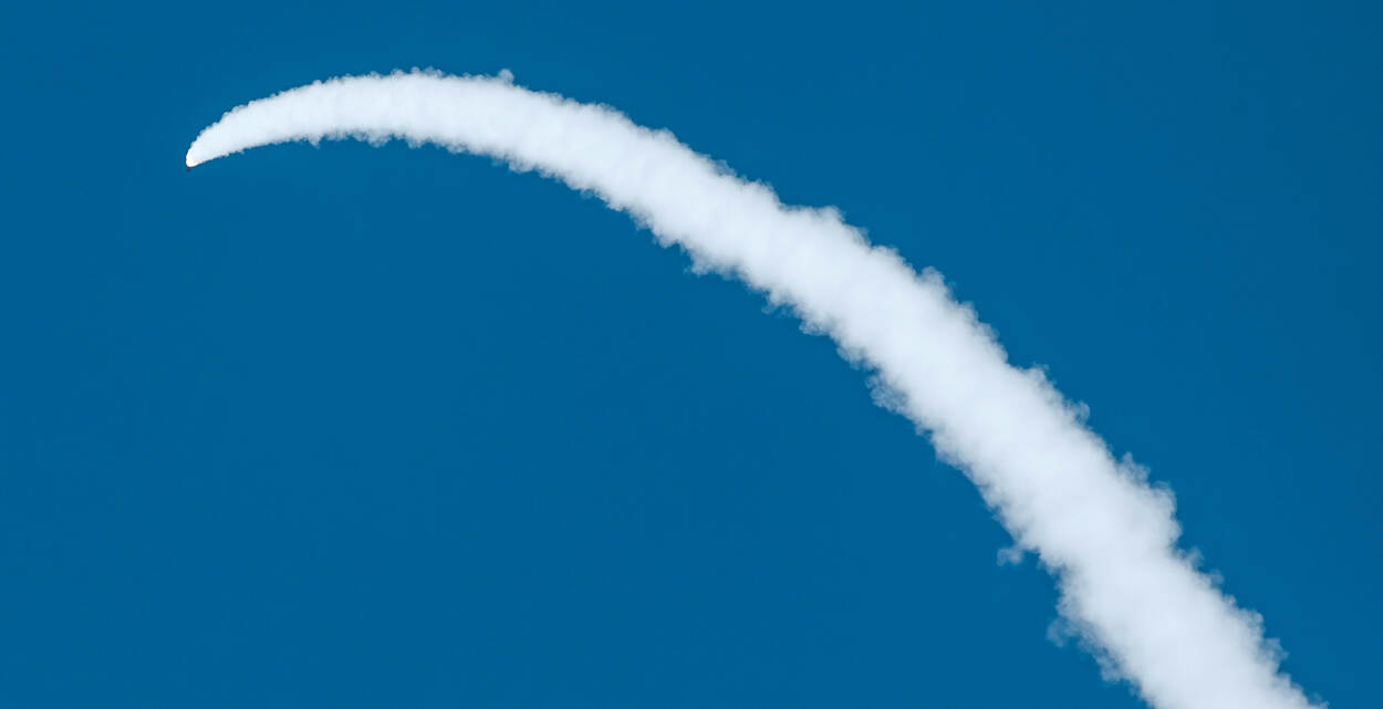 Een gelanceerde Patriot laat een fel wit spoor achter tegen een strakblauwe lucht.