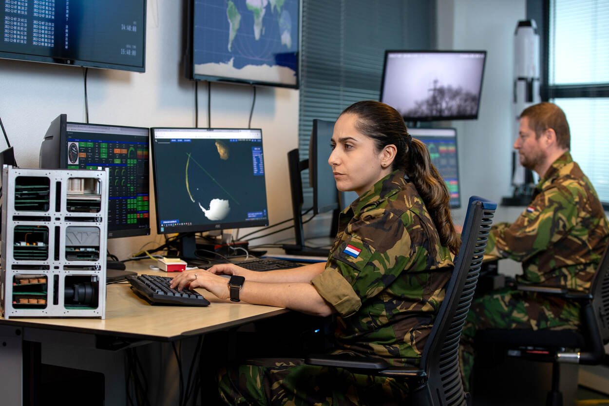Medewerkers van het Defence Space Security Centre in Breda volgen de verrichtingen van de BRIK-II. Foto: sergeant-majoor Maartje Roos