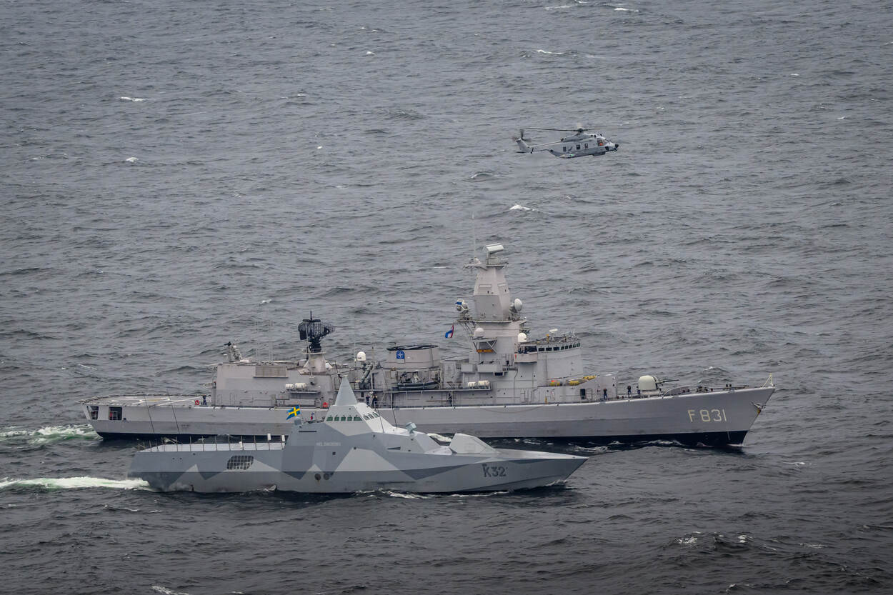 Het Nederlandse fregat werkt onder meer samen met het Zweedse Visby-klasse korvet Helsingborg. Boven de twee schepen vliegt een Zweedse NH90.