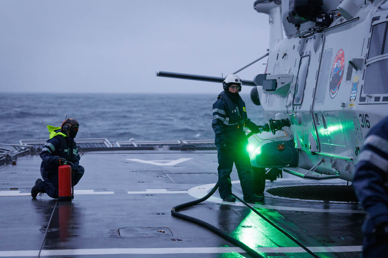 Op het helikopterdek wordt de NH90 bijgetankt.